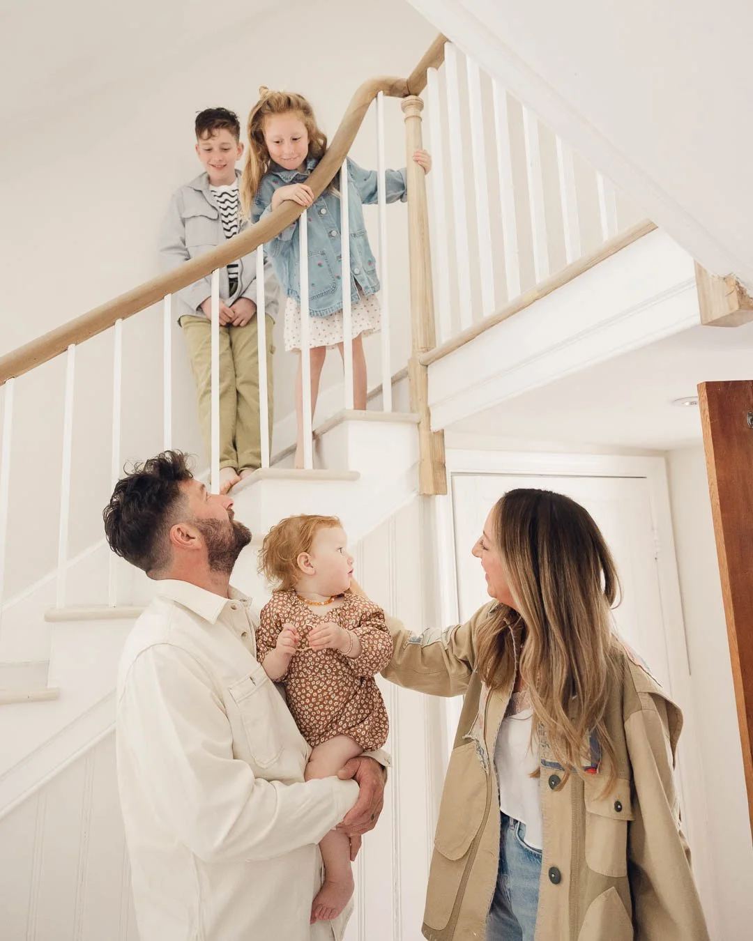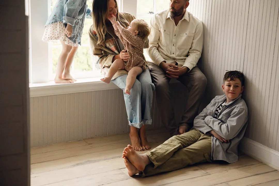 We have months left of mostly indoor family photos here in Vermont (though I’m certainly not opposed to outdoor ones in any weather!) and this family session is the epitome of a relaxed, indoor real-life shoot. We ate snacks, siblings played and bickered, and everyone’s true personality was front and center. This house was really special to this family and they were eager to have photos taken in it to memorialize their time makign it what it is today. These are often my favorite types of family sessions because, at the heart of it, we are hanging out and getting to know each other. You’ll often find me making gentle requests to move into good lighting or asking a kid to show off a cool skill for me again so I can get it on camera. My goal in your family sessions is to always get the most natural interactions between all of you that I can.
